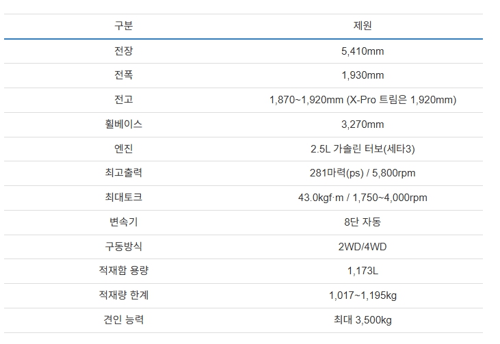 | 엔진 | 2.5L 가솔린 터보 / 3.5L V6 하이브리드 |