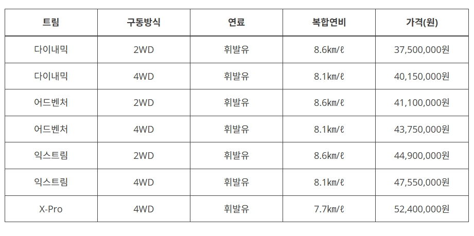 위 표는 기아 타스만 가격 구성 요소별 비교 정보입니다. 표를 통해 쉽게 비교하고 예산 계획을 세우실 수 있죠.